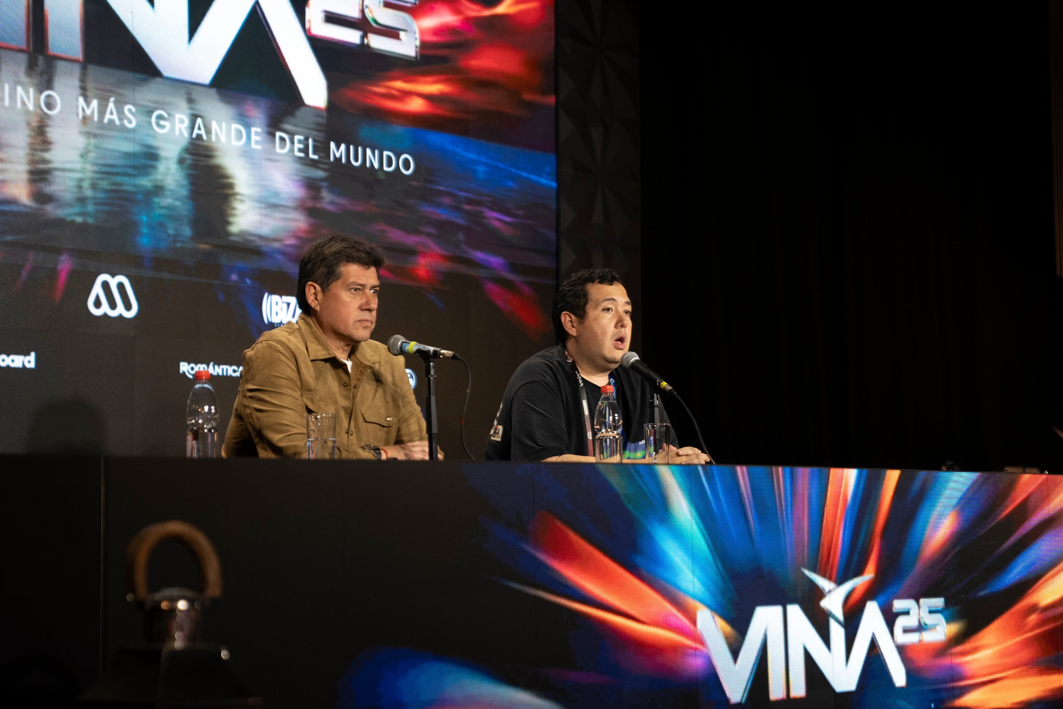 AME3584.VIÑA DEL MAR (CHILE), 25/02/2025.- El director ejecutivo de MegaMedia Rodrigo Norambuena (i), y el organizador del Festival de Viña del Mar y representante de Bizarro, Daniel Merino, hablan en una rueda de prensa este martes, tras la cancelación de la tercera jornada del festival de viña del Mar, por el apagón nacional en Viña del Mar (Chile). El Festival Internacional de Vin~a del Mar se vio obligado a reprogramar su tercera noche al pro´ximo sa´bado 1 de marzo debido al estado de emergencia decretado por el gobierno de Chile tras el corte de luz que afecto´ al 99% del pai´s. EFE/ Adriana Thomasa / ADRIANA THOMASA