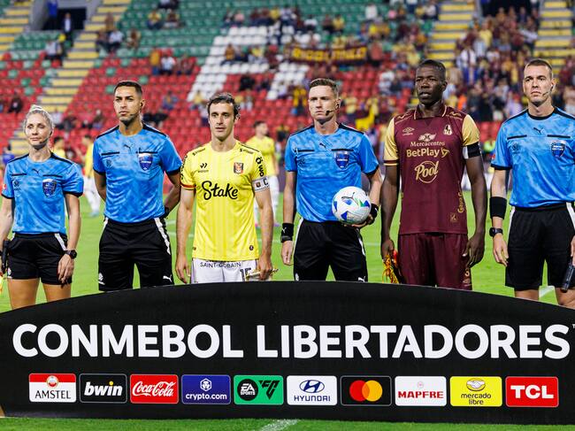 IBAGUE, COLOMBIA - FEBRUARY 20: Horacio Orzan of FBC Melgar (L) and Julian Quiñones of Deportes Tolima (R) pose for official photo with referees during a Copa CONMEBOL Libertadores 2025 match between Deportes Tolima and FBC Melgar at Estadio Manuel Murillo Toro on February 20, 2025 in Ibague, Colombia. (Photo by Mauricio Duque/Eurasia Sport Images/Getty Images) / Eurasia Sport Images