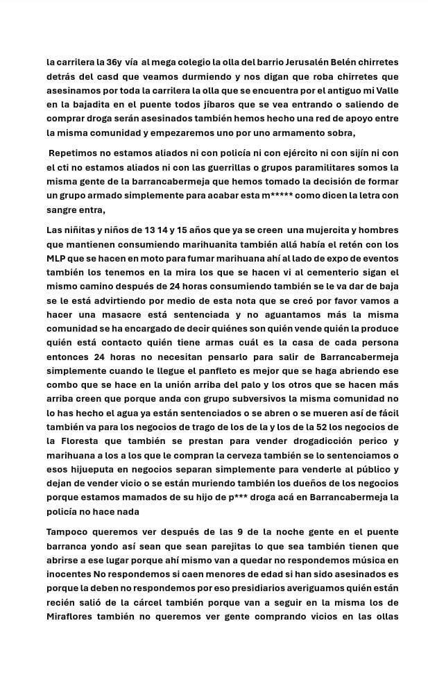 En este pasquín también hacen un llamado a los menores de edad que consuman o comercialicen estupefacientes: “Las niñitas y niños de 13, 15 y 15 años que ya se creen mujercitas y hombres, que mantienen consumiendo marihuana (...), también los tenemos en la mira, los que se hacen vía al cementerio sigan el mismo camino después de 24 horas consumiendo también se les va a dar de baja, se les está advirtiendo por medio de esta nota que se creó, por favor vamos a hacer una masacre, está sentenciada y no aguatamos más...”, se lee textualmente en el panfleto.