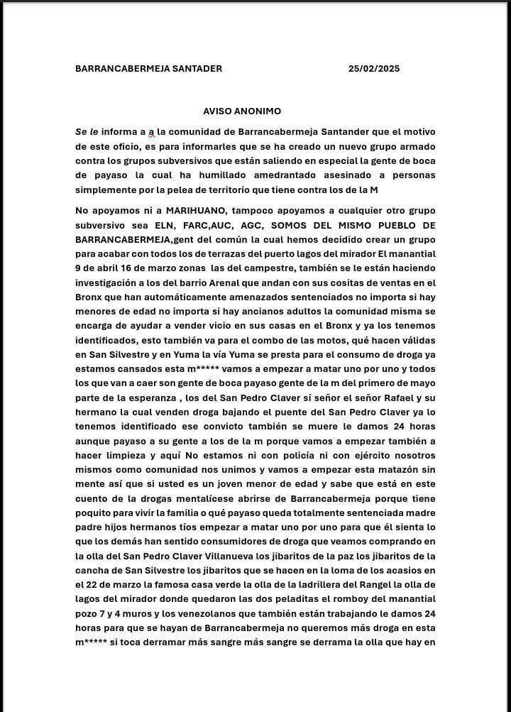 Un reciente panfleto de desconocida procedencia, ha generado alarma entre los habitantes de Barrancabermeja. El texto, que ha circulado en redes sociales, contiene amenazas directas a sectores de la sociedad local, provocando preocupación en la población.