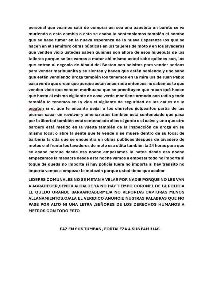 Al finalizar el comunicado hacen un llamado a líderes comunales y a las autoridades locales del Distrito: “Líderes comunales, no se metan a velar por nadie, porque no les van agradecer. Señor alcalde no hay tiempo. Coronel de la Policía le quedó grande Barrancabermeja, no reporta captura, menos allanamientos. Señores de los derechos humanos a metros con todo esto”. Entre otros mensajes en tono intimidatorio dirigidos a diferentes sectores de la ciudad: grupos armados, grupos delincuenciales y comunidad en general.