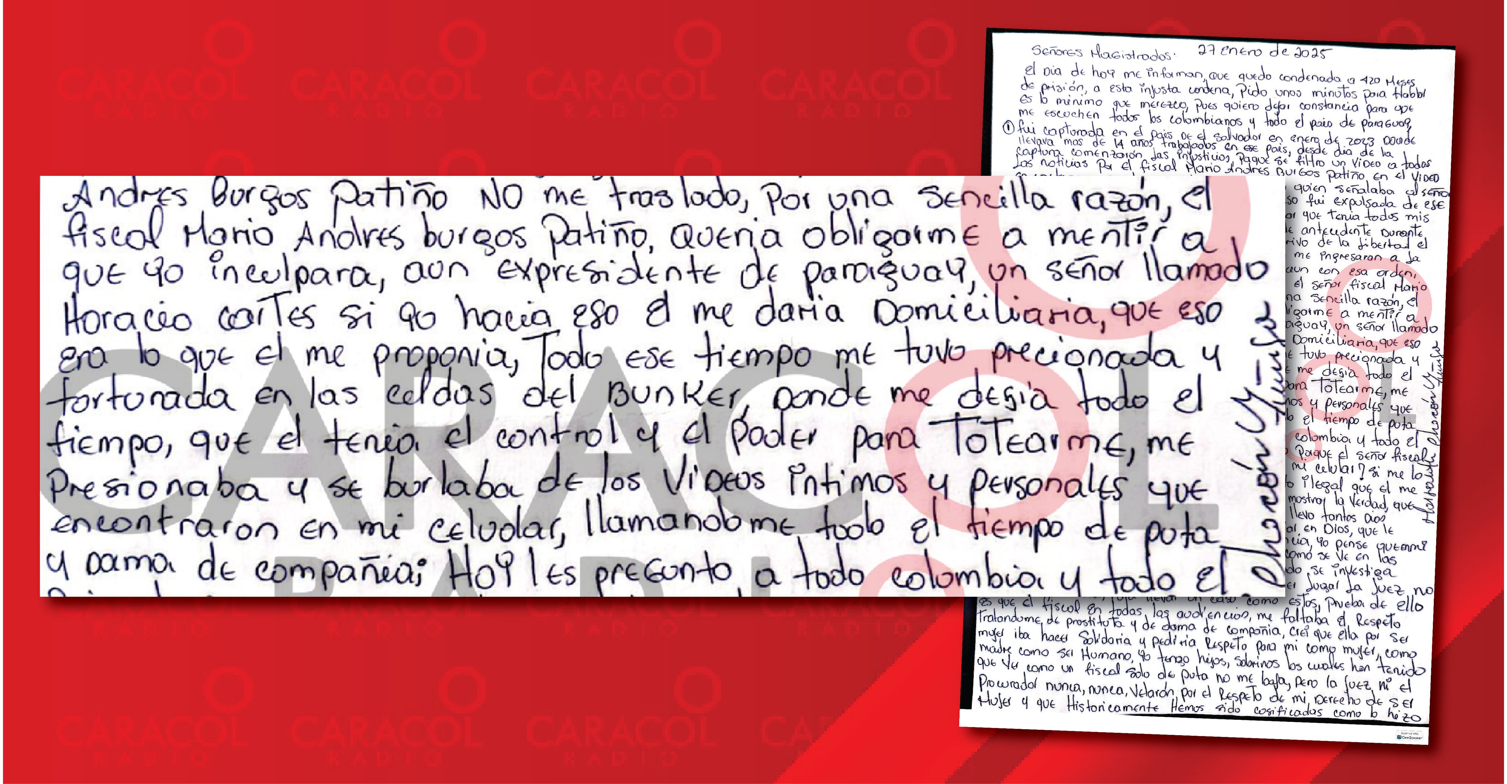 “pasaron más de 4 meses largos en los que el señor fiscal Mario Andrés Burgos Patiño, quería obligarme a mentir, que yo inculpara a un expresidente de Paraguay, un señor Horacio Cartes. Si yo hacía eso él me daría domiciliaria, que eso era lo que me proponía” (…) “Todo ese tiempo me tuvo presionada y torturada en las celdas del búnker donde me decía todo el tiempo que él tenía el control y el poder para “totearme”, me presionaba y se burlaba de los videos íntimos y personales que encontraron en mi celular, llamándome todo el tiempo de puta y dama de compañía”.
