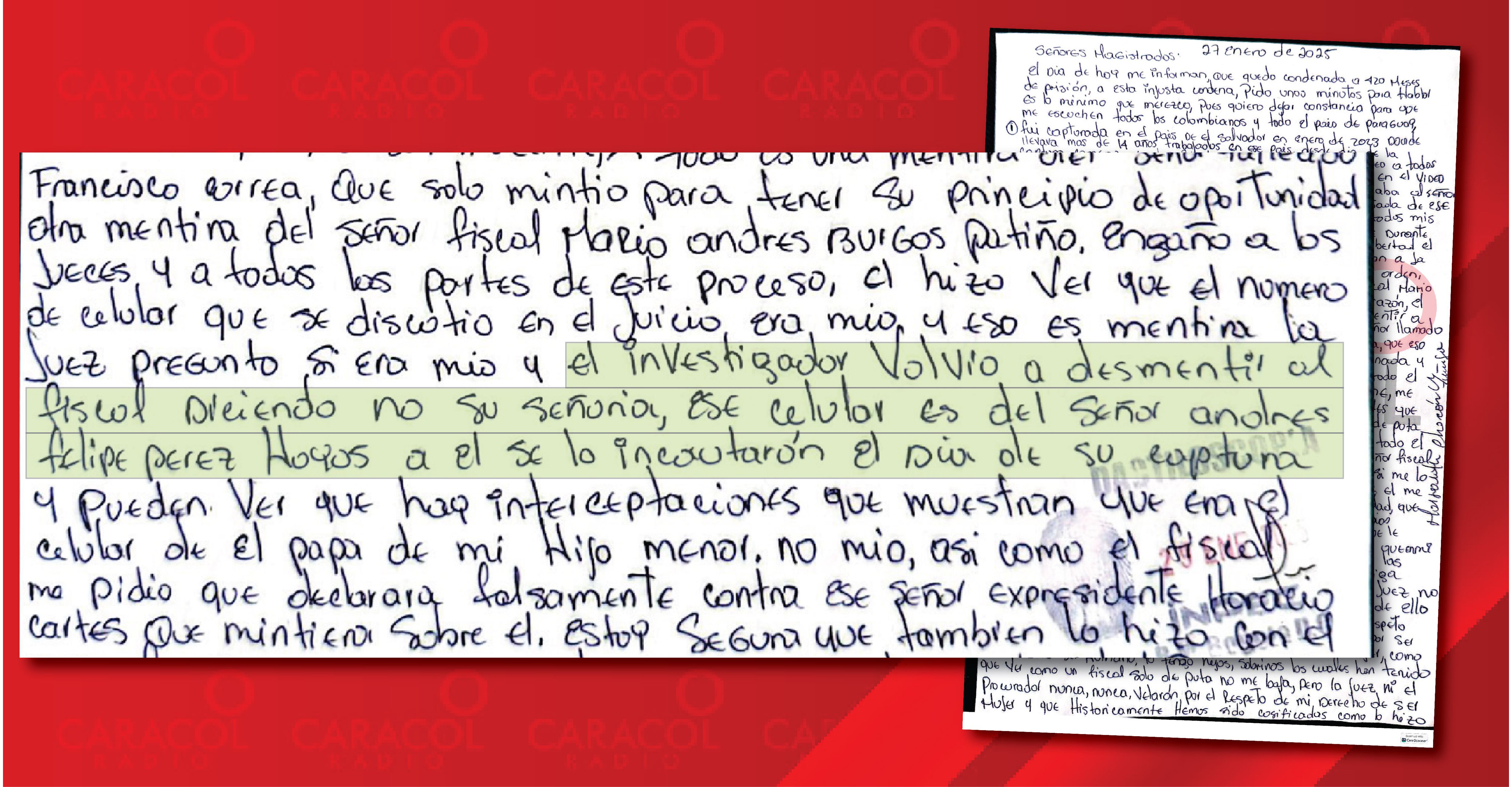 “El señor Mario Burgos engañó a los jueces y a todas las partes de este proceso, él hizo ver que el número del celular que se discutió en el juicio era mío y eso es mentira. La juez preguntó si era mío y el investigador volvió a desmentir al fiscal diciendo no su señoría, ese celular es del señor Andrés Felipe Pérez Hoyos, a él se lo incautaron el día de su captura y pueden ver que hay interceptaciones que muestran que era el celular del papá de mi hijo menor, no mío”… “Así como el fiscal me pidió que declarara falsamente contra ese señor expresidente Horacio Cartes, que mintiera sobre él, estoy segura de que también lo hizo con el señor Francisco Correa para darle su principio de oportunidad”.