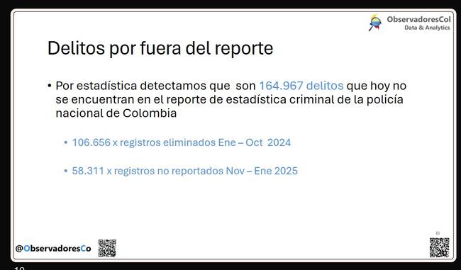 El Centro de Investigación Observadores Colombia presentó un informe alertado sobre una posible eliminación de más de 106 mil registros de delitos en las estadísticas de la Policía Nacional.