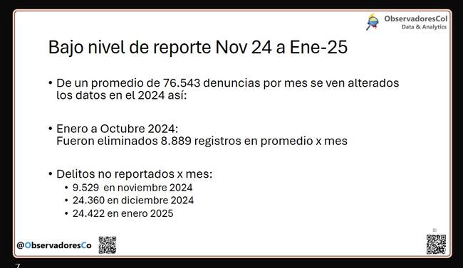 Observadores Colombia monitorea mensualmente las cifras de seguridad del país con base en los reportes oficiales. Sin embargo, en noviembre de 2024 detectaron una disminución inusual del 34% en promedio en los registros de estos delitos.