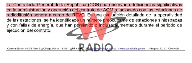 El ente comentó que hay “fallas significativas en la administración y operación del contrato de AOM relacionado con las estaciones de radiodifusión sonora a cargo de RTVC. En una evaluación detallada de la operatividad de las estaciones, se ha identificado un número preocupante de estaciones siniestradas y con fallas de energía, que han persistido o incluso aumentando durante el periodo de ejecución del contrato”.