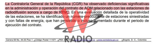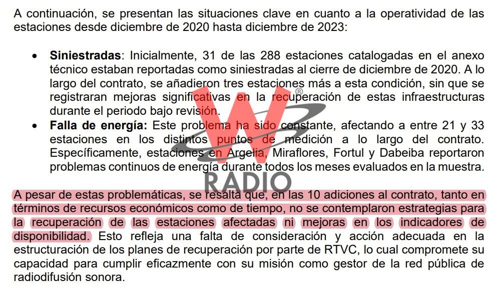 El ente comentó que hay “fallas significativas en la administración y operación del contrato de AOM relacionado con las estaciones de radiodifusión sonora a cargo de RTVC. En una evaluación detallada de la operatividad de las estaciones, se ha identificado un número preocupante de estaciones siniestradas y con fallas de energía, que han persistido o incluso aumentando durante el periodo de ejecución del contrato”.
