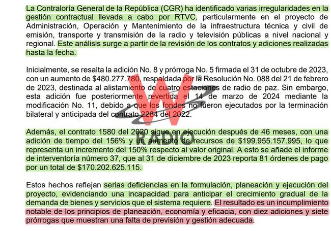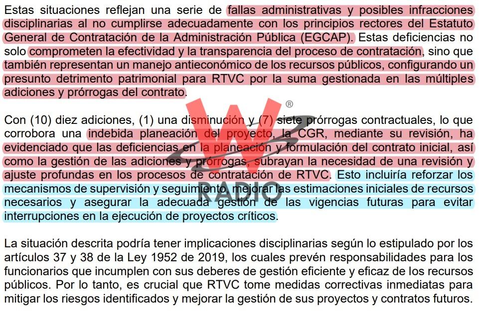 De hecho, una situación similar ya la había advertido la Contraloría General de la República en una comunicación de observaciones que W Radio tiene en primicia, llamada Auditoría Financiera RTVC 2024 del 2 de mayo del 2024 en la que ve algunos contratos.