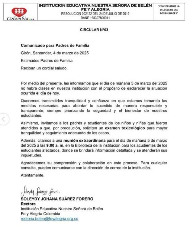 Este miércoles 5 de marzo el colegio Nuestra Señora de Belén, institución educativa de Fe y Alegría en Girón, suspendió clases tras la masiva intoxicación alimentaria de niños entre los 5 y 8 años, de grados de Transición a Tercero de primaria.