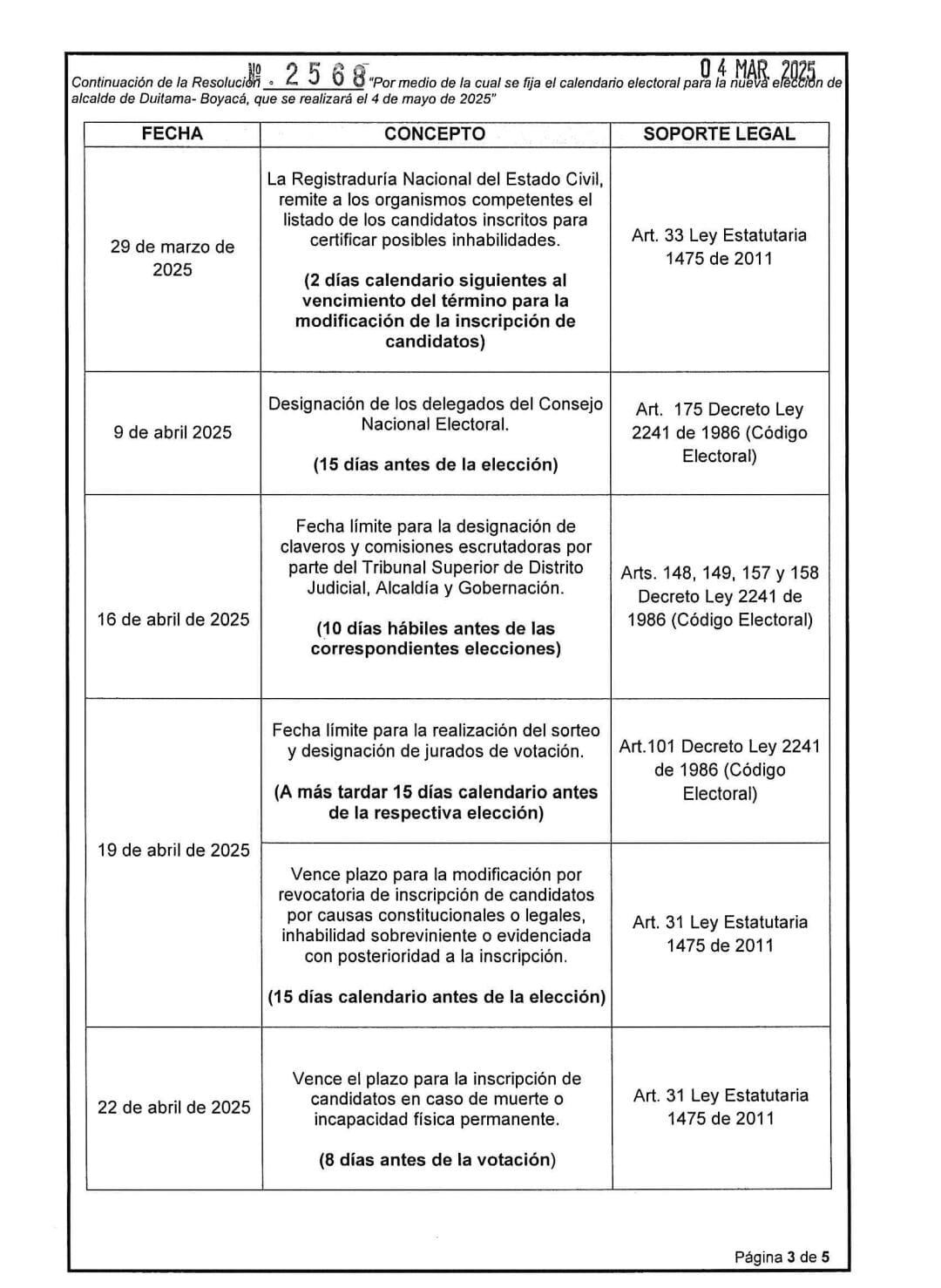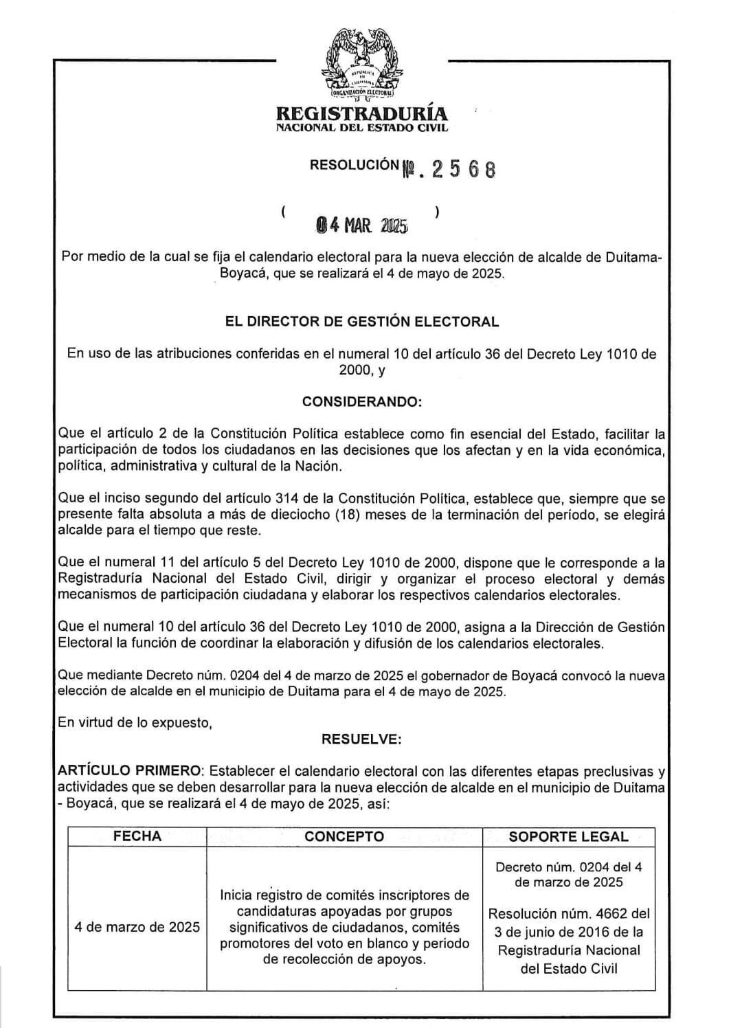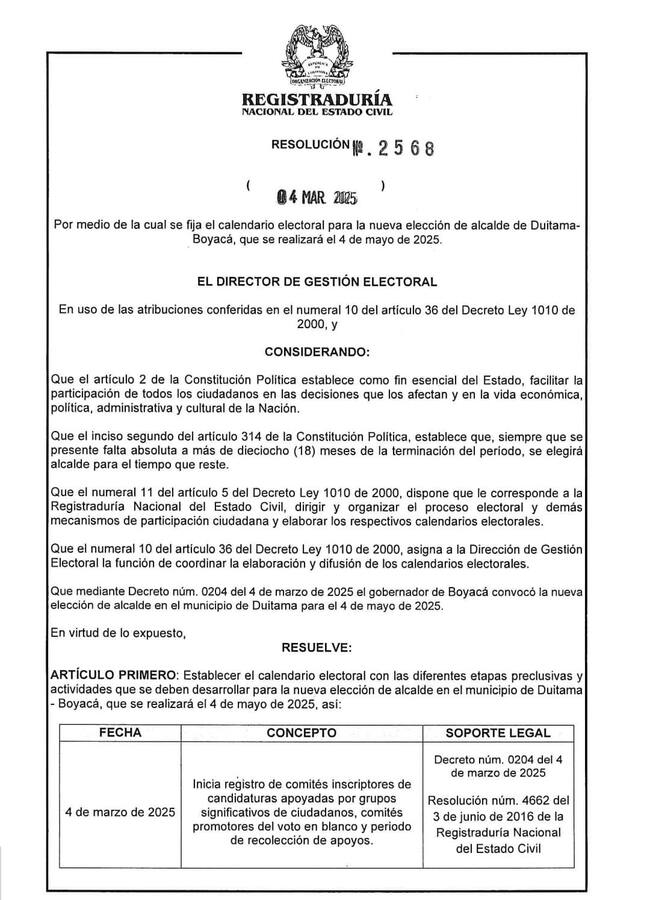 La Registraduría Nacional del Estado Civil dio a conocer el calendario electoral con las diferentes etapas preclusivas y actividades que se deben desarrollar para la nueva elección de los alcaldes de los municipios de Duitama, Nuevo Colón y La Victoria en Boyacá.