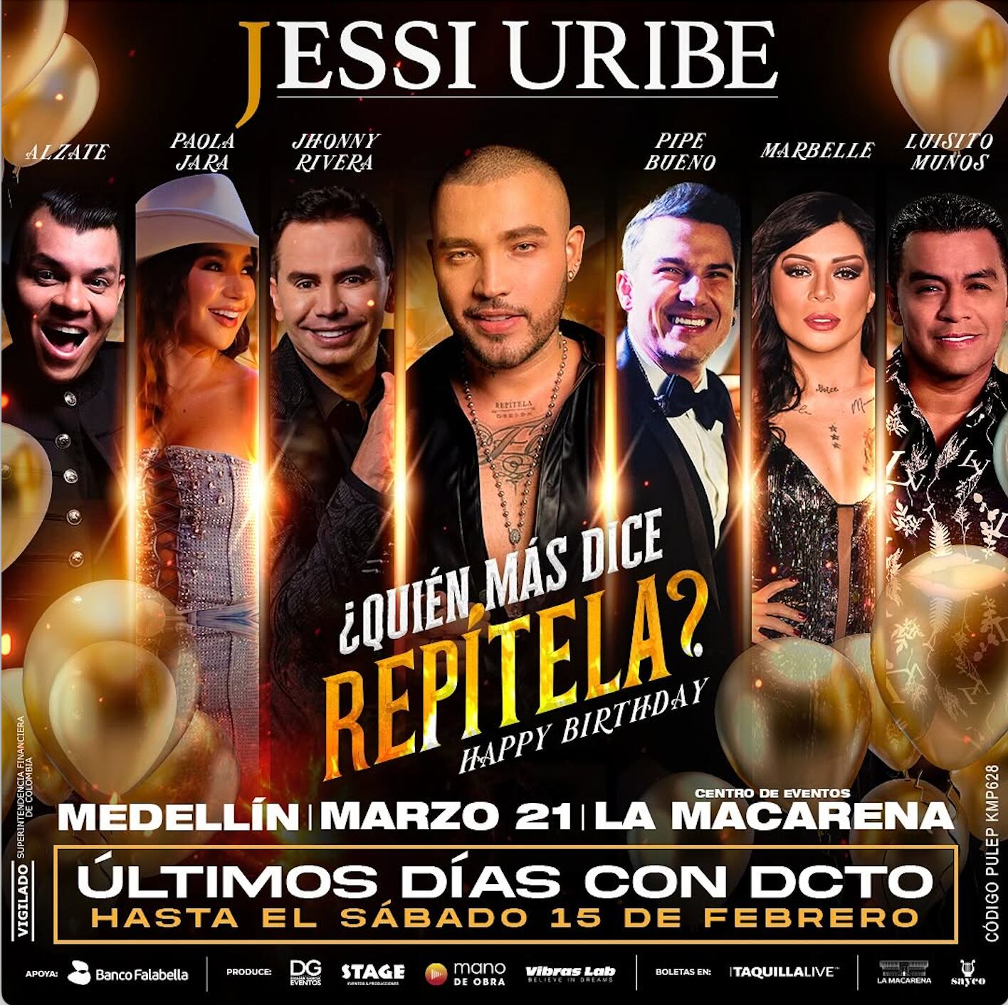 El artista colombiano Jessi Uribe, ha anunciado el concierto más esperado del primer semestre del año, un espectáculo que promete ser una noche inolvidable para sus seguidores. La cita será el viernes 21 de marzo en el emblemático Centro de Eventos La Macarena en Medellín, donde Jessi Uribe ofrecerá un show cargado de emociones, grandes éxitos y una producción de primer nivel que promete superar todas las expectativas, acompañado por Pipe Bueno, Paola Jara, Alzate, Marbelle y Luisito Muñoz, entre otros, el cantante promete una noche inolvidable llena de éxitos y sorpresas.