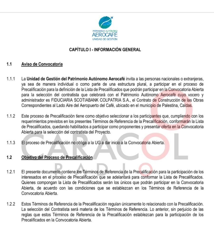 Según el documento enviado desde la Secretaría de la Transparencia del Gobierno Nacional, “el Manual de Contratación del patrimonio autónomo de AEROCAFÉ establece que los procesos de más de 600 SMLMV deben adelantarse por convocatoria pública (salvo que se contrate por vía directa); pero cuando se adelanta precalificación, ésta es un capítulo de la Convocatoria Abierta, por lo que no podría hacerse de forma autónoma, como es el caso”.