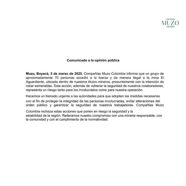 Compañías Muzo Colombia informa que un grupo de 70 personas ingresó ilegalmente a la mina El Aguardiente en Quipama, presuntamente para robar esmeraldas.