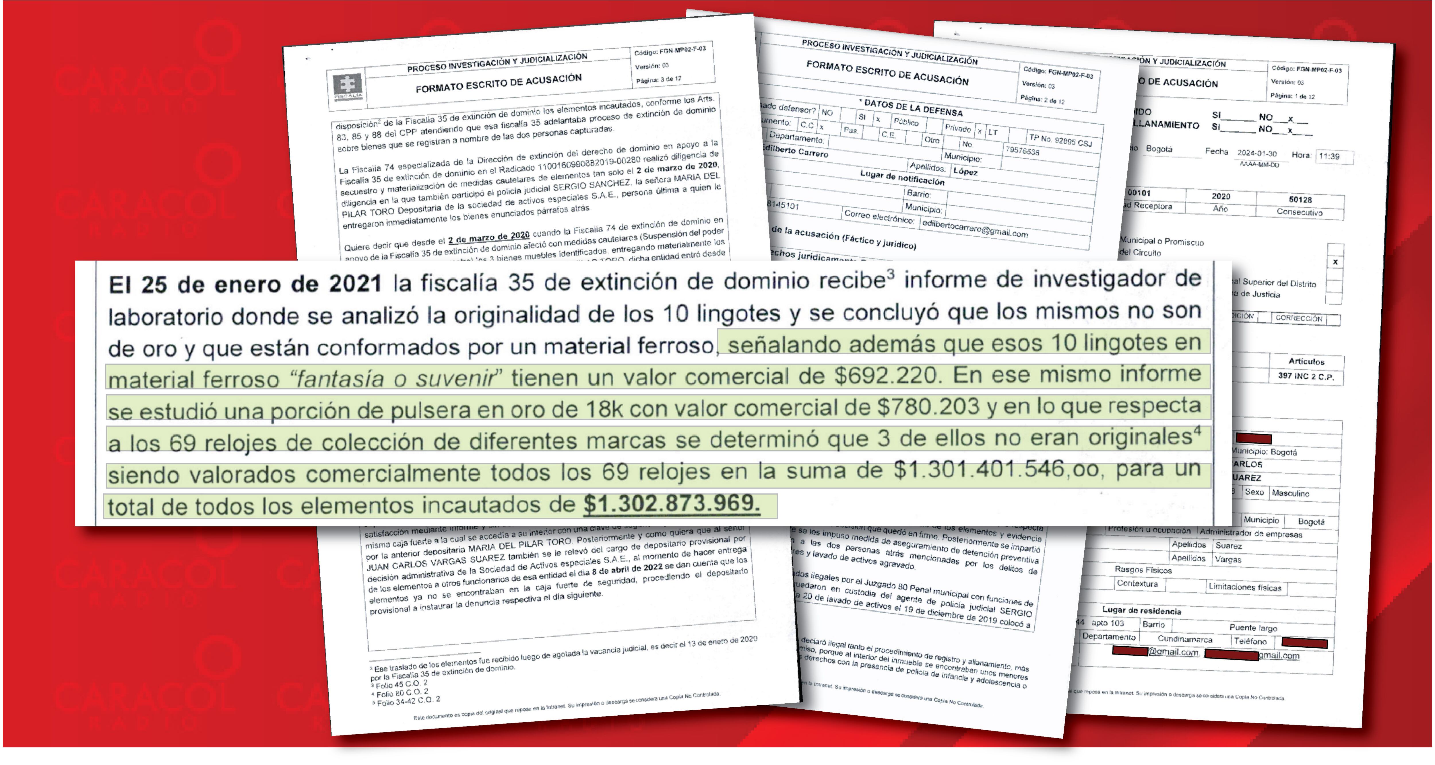 Caracol Radio conoció que la Fiscalía llamó a juicio a Juan Carlos Vargas, un exdepositario de la Sociedad de Activos Especiales, por ser uno de los presuntos responsables del extravío de 10 supuestos lingotes de oro, una pulsera de 18 kilates, y una colección de 69 relojes avaluados en más de $1.300 millones y que fueron incautados al antiguo capo de la mafia Carlos Felipe Toro, alias ‘Pipe Montoya’.