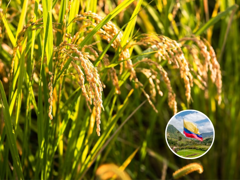 Cultivo de arroz y al lado una bandera de Colombia (Fotos vía Getty Images)