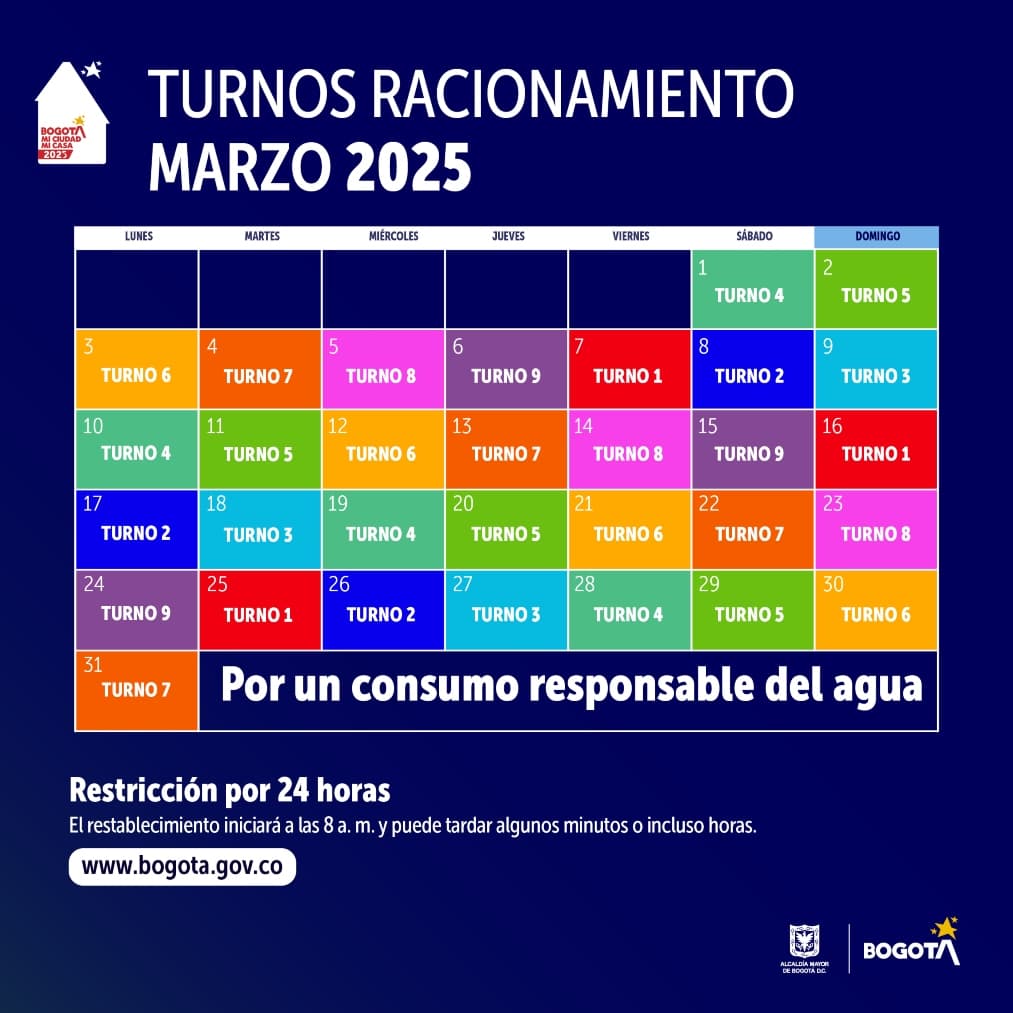 Turnos de racionamiento marzo 2025. Foto: Alcaldía de Bogotá