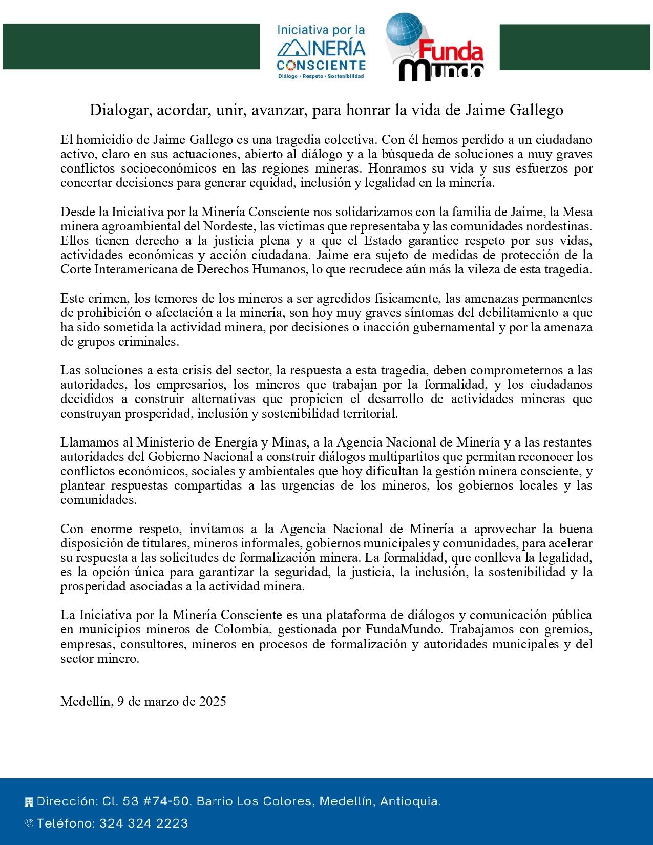 En el escrito manifestaron que “el homicidio de Jaime Gallego es una tragedia colectiva. Con él hemos perdido a un ciudadano activo, claro en sus actuaciones, abierto al diálogo y a la búsqueda de soluciones a muy graves conflictos socioeconómicos en las regiones mineras. Honramos su vida y sus esfuerzos por concertar decisiones para generar equidad, inclusión y legalidad en la minería”.