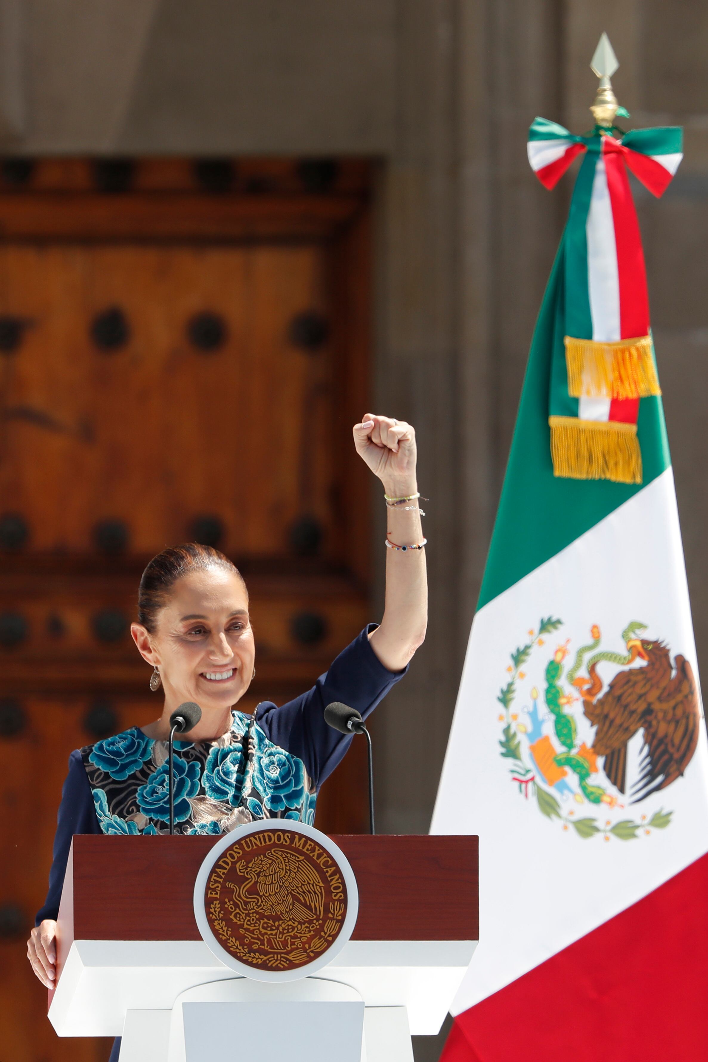 “No podemos ceder en nuestra soberanía, ni puede resultar afectado nuestro pueblo por decisiones que tomen gobiernos o hegemonías extranjeras”, afirmó Sheinbaum en una tarima instalada frente a Palacio Nacional, sede del gobierno.