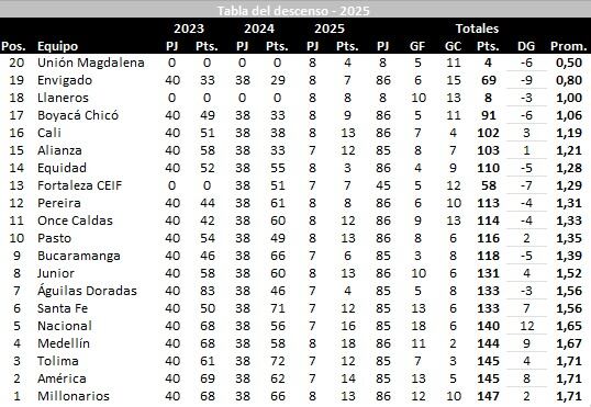 El equipo más cercano a la zona roja del fútbol colombiano es Llaneros, que ha logrado escalar una posición en dicha tabla, y parcialmente, está salvando la categoría. No obstante, El Equipo de la Media Colombia cayó ante Deportivo Pasto 1-0 con una anotación de Johan Parra en la fecha 8, y no pudo aprovechar el tropiezo de Envigado para sacarle más diferencia en el promedio. Llaneros sigue tercero en la tabla del descenso y tiene 1,00 de promedio.