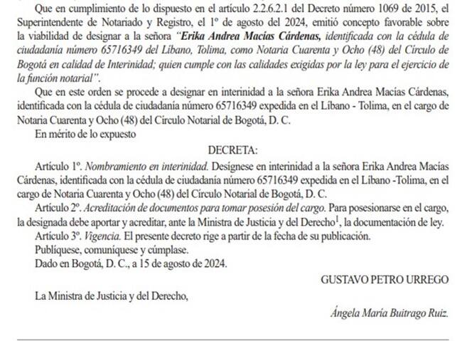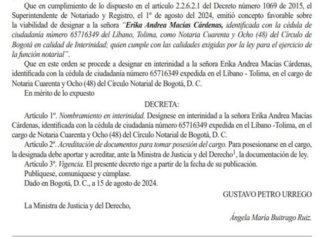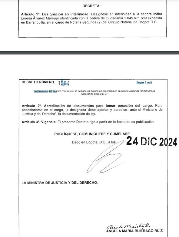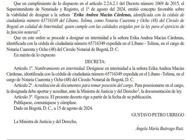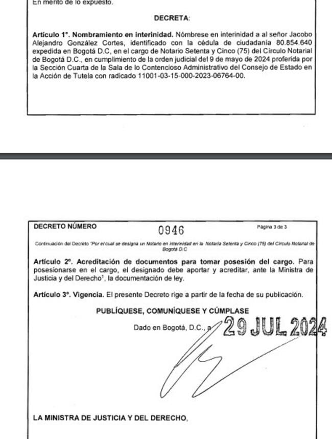 El 29 de julio fue nombrado Jacobo Alejandro González en la notaría 75 de Bogotá. Antes de convertirse en notario, González era el director de Operaciones Jurídicas en el bufete de Mauricio Pava, jurisconsulto íntimamente vinculado a la ministra Laura Sarabia. Vea a continuación este decreto: