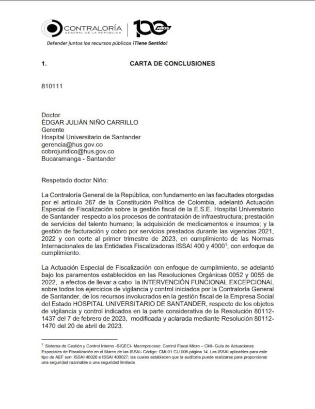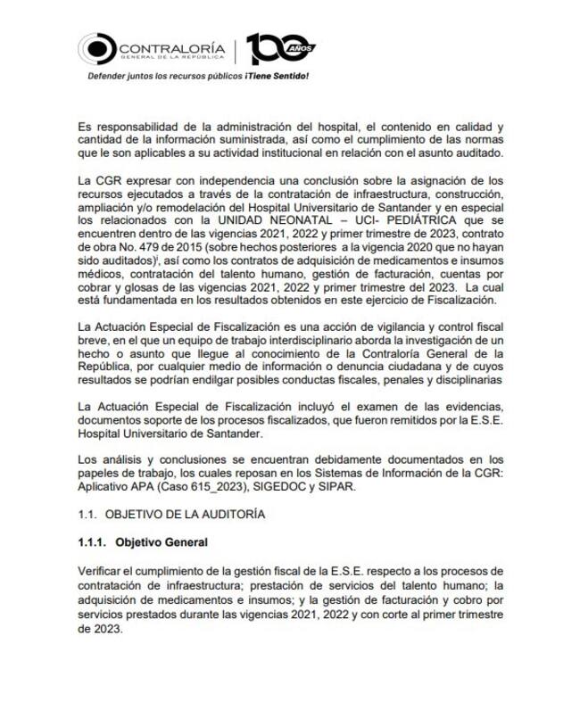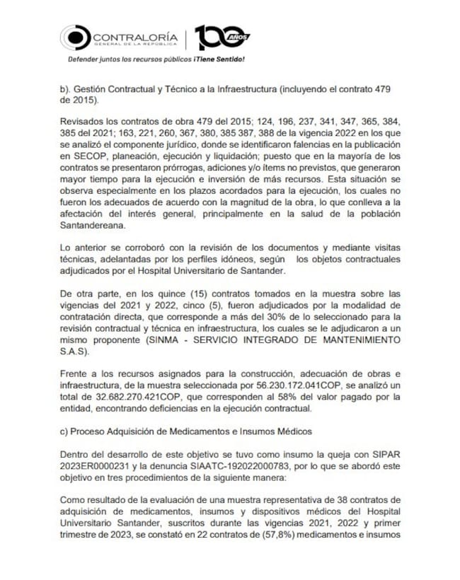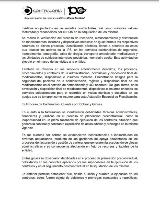 Sin embargo, La W conoció el informe completo de 253 páginas que la misma Contraloría hizo sobre la gestión del Hospital Universitario de Santander durante los últimos tres años de su gerencia. En ella se establecían 17 hallazgos disciplinarios, 2 de incidencia penal y 4 hallazgos fiscales.