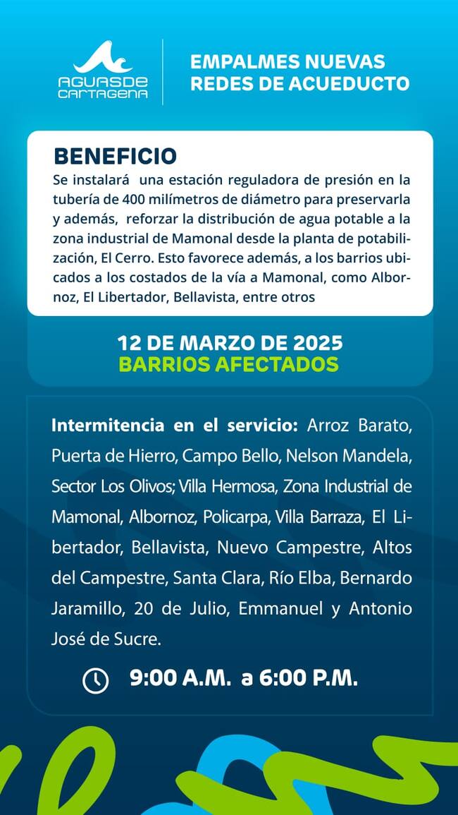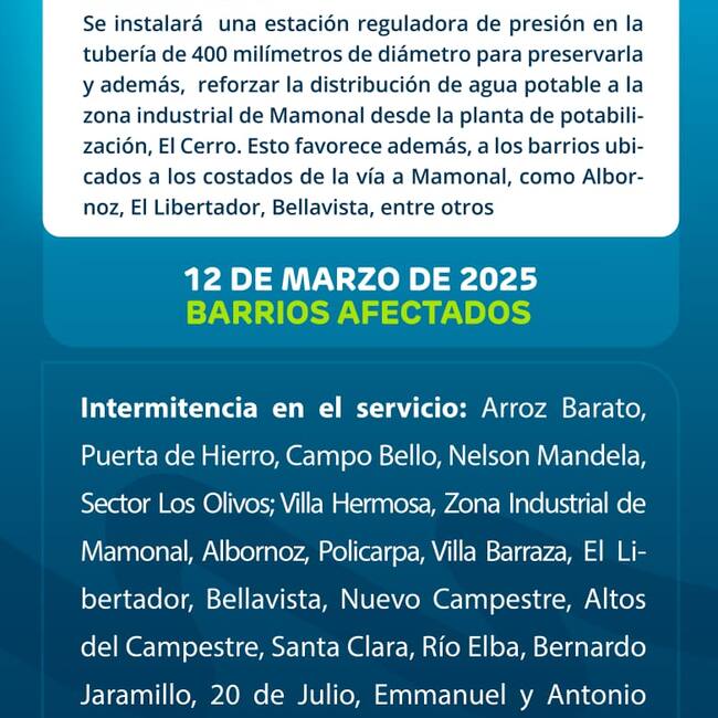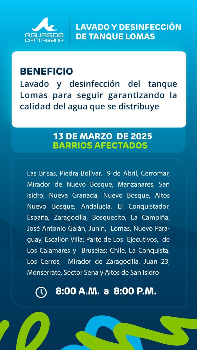 La empresa Aguas de Cartagena realizará una intervención en el tanque El Carmelo, por tal motivo, este miércoles 12 de marzo desde las 8:00 a.m. no tendrán servicio algunas comunidades del distrito, y otras presentarán intermitencia en el suministro.
