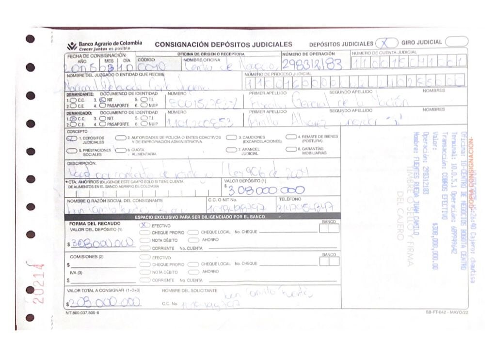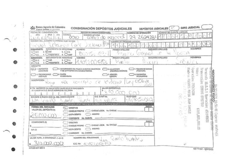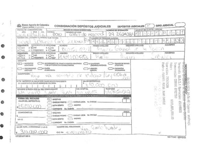 Las dos consignaciones que hizo Sneyder Pinilla para reintegrar el dinero robado