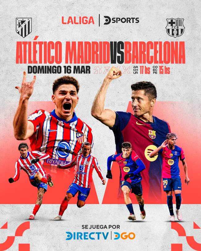 La 28° jornada de LaLiga EA Sports promete emociones al máximo con el enfrentamiento entre Atlético de Madrid y Barcelona, dos de los equipos más destacados de la temporada 2024-25. El partido, que podría definir el rumbo del campeonato español, se podrá ver en exclusiva por la señal deportiva DSPORTS (canales 610 y 1610 HD de DIRECTV) y en la plataforma de streaming DGO. Además, en una experiencia sin precedentes, el encuentro será proyectado en las salas de cine de Royal Films en más de 20 ciudades de Colombia, gracias a una alianza con DIRECTV.