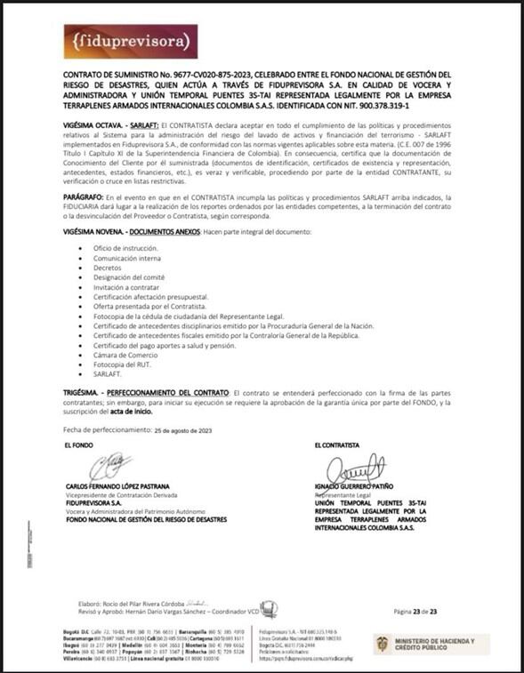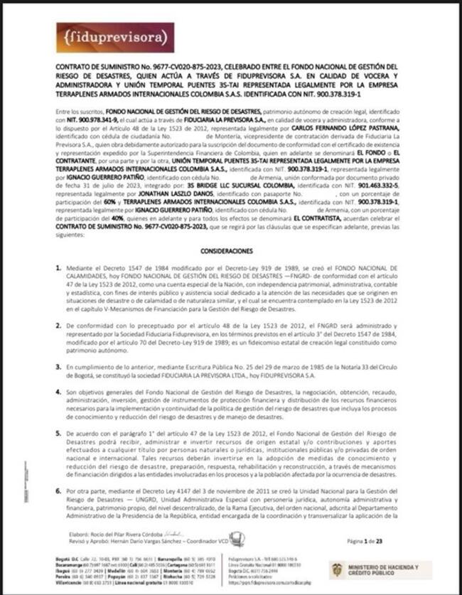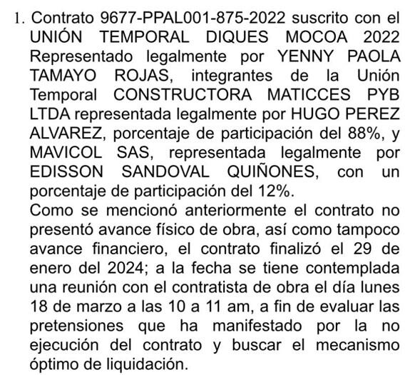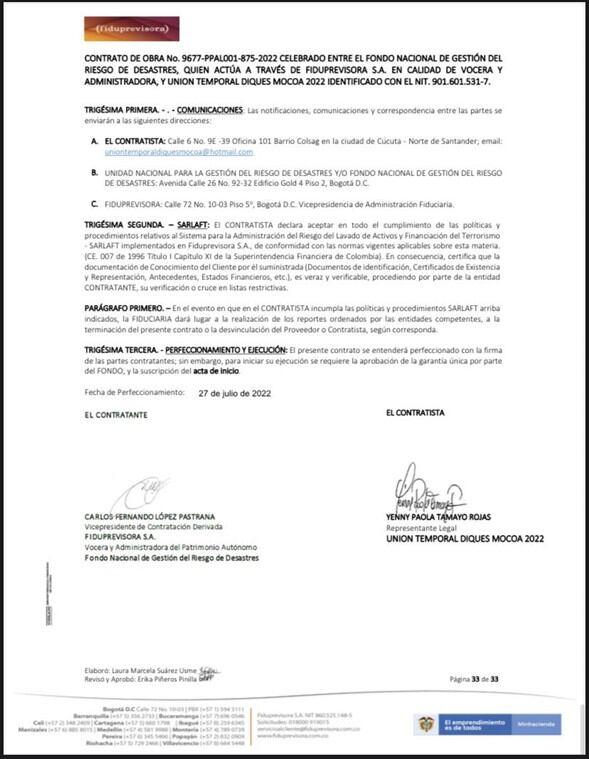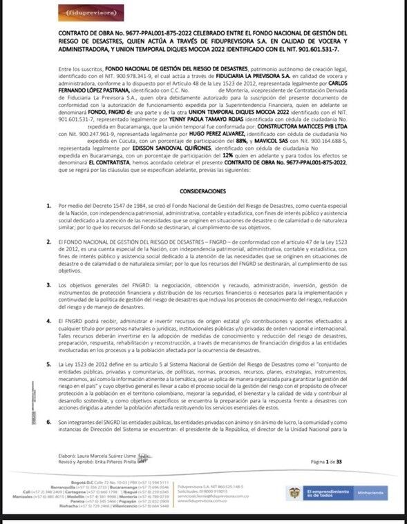 Hay que recordar que Carlos López llegó a la Fiduprevisora durante el gobierno Duque, lo cual hace interesante revisar también los contratos que viabilizó en aquella época, por ejemplo, el que firmó con la Unión Temporal Diques Mocoa 2022, que garantizaba más de 20.000 millones de pesos para un contrato para prevenir futuras avalanchas, pero que nunca se ejecutó.