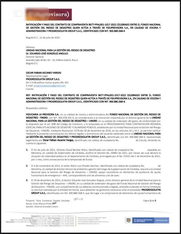 Así mismo, López fue quien firmó varios contratos con una desconocida empresa de Cúcuta, que, curiosamente, era de una de las preferidas del entonces director de Gestión del Riesgo, Eduardo José González, para comprar cualquier cantidad de cosas como alimentos, herramientas, ropa y un largo etcétera que siempre pagaba con grandes sobrecostos: Progressolatin Group. SAS.