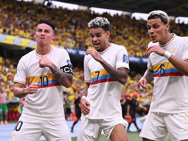 Luis Díaz celebra su gol junto a James Rodríguez (izq.) y Richard Ríos (der.). (Photo by RAUL ARBOLEDA / AFP) (Photo by RAUL ARBOLEDA/AFP via Getty Images) / RAUL ARBOLEDA