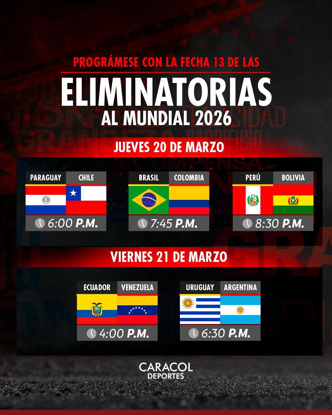 La jornada 13 se disputará en dos días diferentes. En el primer día, Brasil y Colombia protagonizarán el plato fuerte; mientras que Argentina y Uruguay harán lo propio al día siguiente. Así se jugará la fecha 13: