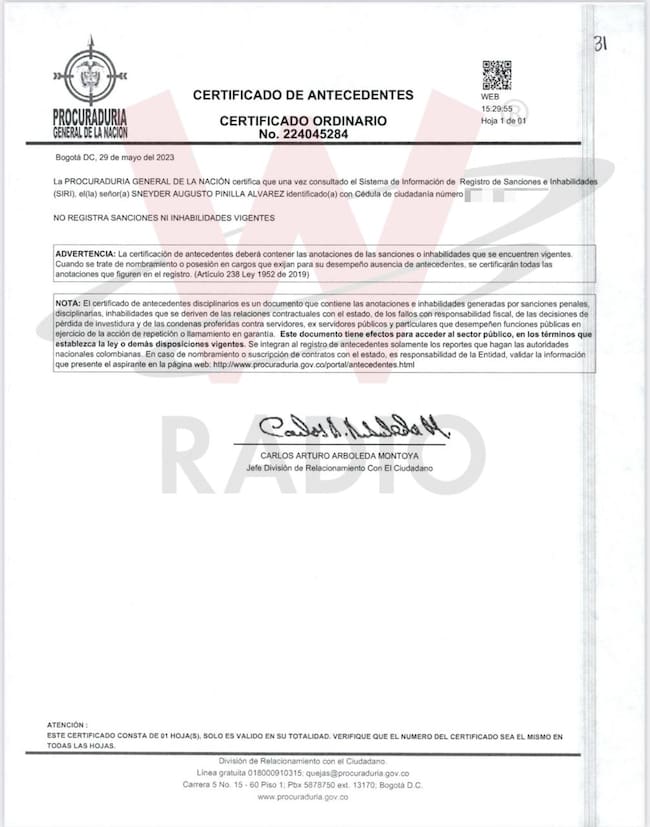 El segundo, emitido apenas 16 días después, e incorporado a la hoja de vida oficial de Pinilla muestra que no tenía inhabilidad alguna el 29 de mayo de 2023.