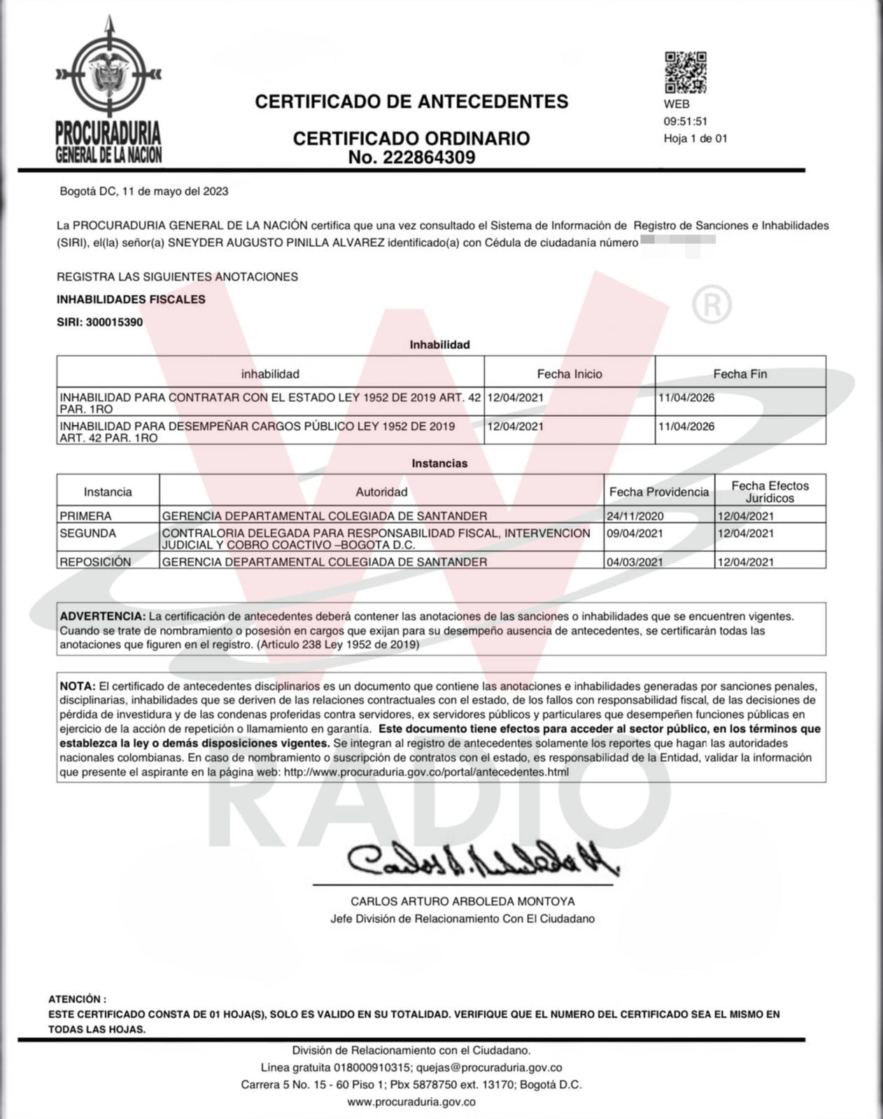 El primero, expedido el 13 de mayo de 2023, señala que Pinilla estaba inhabilitado para ocupar cargos públicos y contratar con el Estado desde el 12 de abril de 2021 y su período de inhabilidad terminaba el 11 de abril de 2026.