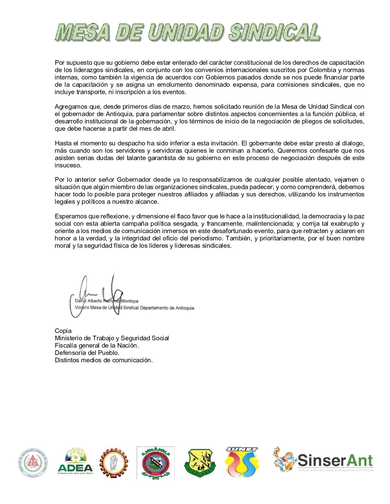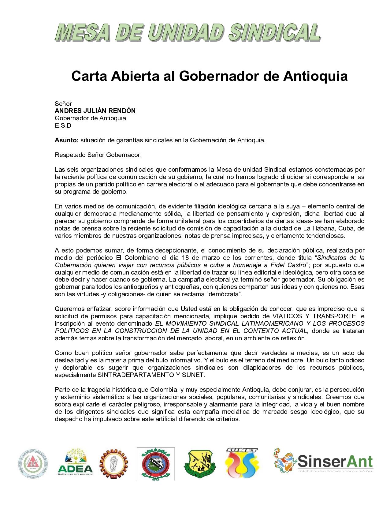 Carta al gobernador de Antioquia de la Mesa de Unidad Sindical