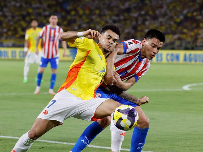Luis Díaz (i) de Colombia disputa el balón con Diego Gómez de Paraguay este martes en un partido de las eliminatorias sudamericanas para el Mundial de 2026 entre las selecciones de Colombia y Paraguay en el estadio Metropolitano Roberto Meléndez en Barranquilla (Colombia). EFE/Mauricio Dueñas Castañeda / Mauricio Dueñas Castañeda (EFE)