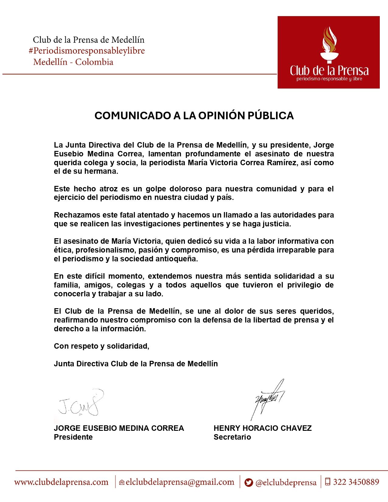 Mientras que desde el Círculo de Periodistas del Oriente Antioqueño también elevaron su voz de rechazo por el doble crimen, “nos solidarizamos con su familia y todos sus allegados y con Club de la Prensa de Medellín, al cual estaba afiliada desde hace varios años. Instamos a las autoridades a esclarecer los hechos y a dar con el paradero de los responsables. ¡Descansa en Paz querida Vicky! QEPD”.