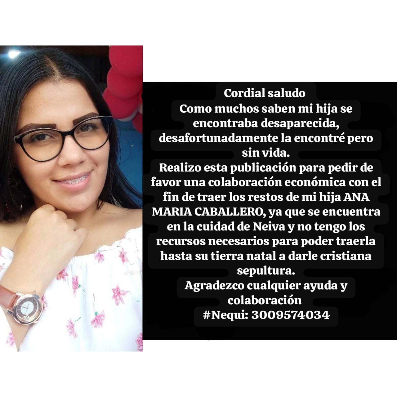 Ana maría Caballero Varón, había llegado en compañía de su novio a la ciudad de Neiva en septiembre del año 2.023 para vender un vehículo que habían ofertado por redes sociales y desaparecieron, luego de una intensa búsqueda, fueron encontrados en una fosa común, incinerados en compañía de otros cuatro cuerpos.