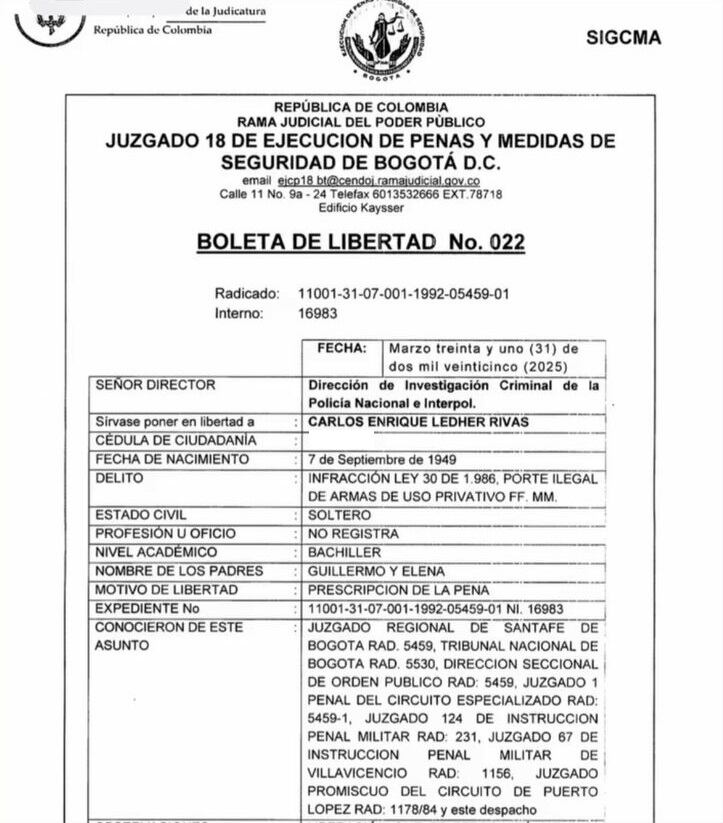 Esta es la boleta de libertad de Carlos Enrique Lehder Rivas: