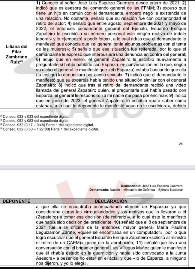 “Señaló que entre agosto, septiembre de 2021 y mayo de 2022, el entonces comandante general del Ejército, general Eduardo Enrique Zapateiro le escribió a su número personal sin ningún motivo de índole laboral y le empezó a pedir fotos a lo cual adujo que el demandante le manifestó que conocía que “el general tenía algunos problemas con el tema de las mujeres”. 5) Señaló que esa situación fue reiterada por lo que el demandante le expresó que interpusiera una denuncia en contra del general. 6) Adujo que en enero el general Zapateiro le escribió nuevamente a preguntarle si había hablado con Esparza que “él (Esparza) estaba buscando que ella (la testigo) lo denunciara por acoso sexual”