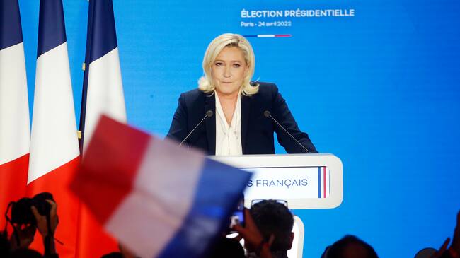 PARIS, FRANCE - APRIL 24: France's far-right party ‘Rassemblement National’ (RN) leader, Marine Le Pen candidate for the 2022 presidential election makes a statement after the results of the votes in the second round at ‘Pavillon d'Armenonville’ on April 24, 2022 in Paris, France. French president Emmanuel Macron defeated Marine Le Pen in the final round of France's presidential election. According to projected results, French President Emmanuel Macron obtains 58,20% of the vote and Marine Le Pen obtains 42,80 % of the vote in the second round of the presidential election. Emmanuel Macron is reelected for the second time to the Presidency of the French Republic. (Photo by Thierry Chesnot/Getty Images) / Chesnot