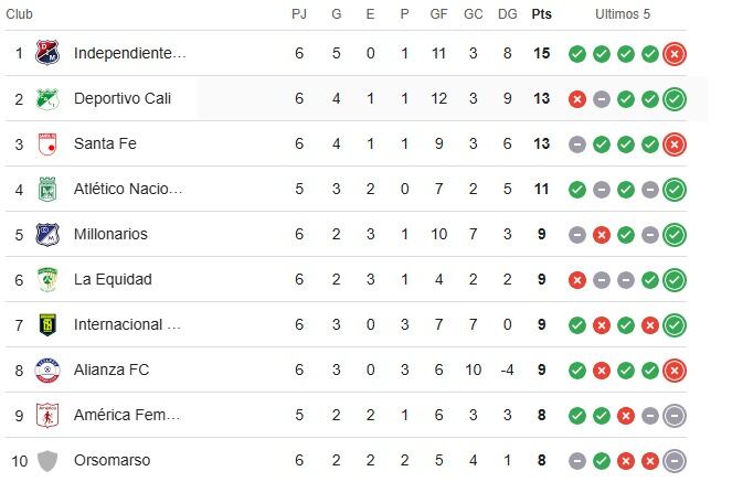 Independiente Medellín es líder del campeonato y registra cinco victorias.
