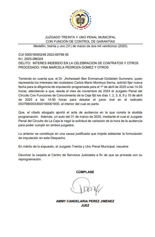 “Dr. Jhohesiash Ben Emmanuel Goldstein Summers, quien representa los intereses del ciudadano Carlos Mario Montoya Serna, solicitó fijar nueva fecha para la diligencia de imputación programada para el 1º de abril de 2025 a las 14.00 horas; atendiendo a que, desde el mes de noviembre de 2024 el Juzgado Penal del Circuito Con Funciones de Conocimiento de la Ceja fijó los días 1, 2, 3, 8, 9 y 10 de abril de 2025 a las 14:00 horas para desatar el juicio oral en el radicado 05376600033920160001600, al interior del cual es parte”, señala la decisión.