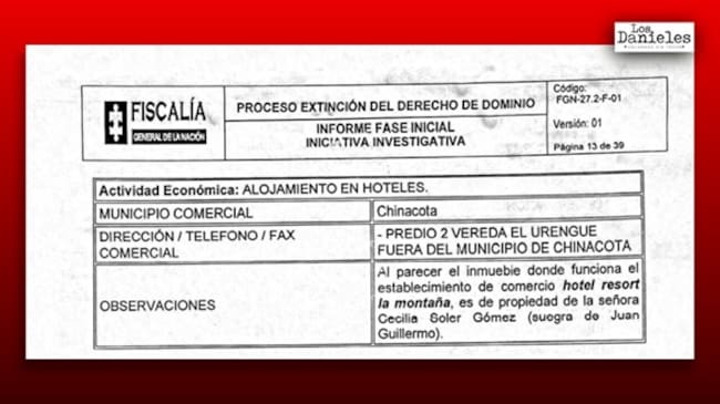 Dentro de los informes de Policía Judicial de la primera operación de extinción de dominio, los agentes dejaron registrado que “Al parecer el inmueble donde funciona el establecimiento de comercio Hotel Resort La Montaña es de propiedad de la señora Cecilia Soler Gómez (suegra de Juan Guillermo)”