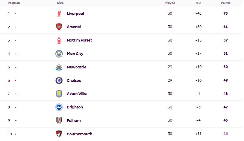Con esta victoria en condición de local, Liverpool llegó a 73 unidades y mantiene las 12 diferencia respecto al Arsenal, que un día antes había derrotado al Fulham. Lucha casi que definida con ocho jornadas por disputar en la liga inglesa.