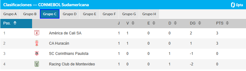 Por su parte, Corinthians y Racing de Montevideo comenzaron con el pie izquierdo y ocupan la parte baja de la tabla sin unidades. El equipo brasileño, que cayó ante Huracán, tiene una diferencia de gol de -1, mientras que los uruguayos, tras su derrota ante América, registran un -2, quedando en la última posición. Ambos clubes están obligados a reaccionar en la siguiente jornada si quieren mantenerse en la lucha por la clasificación.