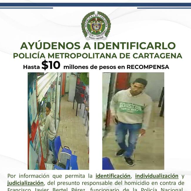 La Policía Nacional en Cartagena avanza en las labores de identificación del presunto delincuente, que, de acuerdo con videos de cámaras de seguridad, sería el responsable del homicidio del subintendente Francisco Javier Bertel Pérez, ocurrido en a pocos metros del CAI de Ceballos en la Transversal 54 durante la mañana del 7 de febrero de 2025.
