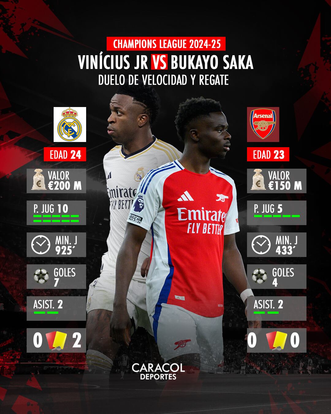 Estadísticas de Vinícius y Saka a nivel de Champions League 2024-2025 / Elaboración: Caracol Radio
