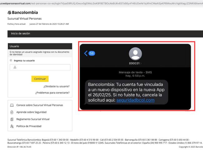 Un caso típico es que los usuarios reciban un mensaje de texto sobre alguna novedad con su cuenta bancaria. En el mensaje le piden que entre a un enlace para verificar tal información. En estos casos, los ladrones crean páginas muy similares a las originales y desde allí les piden su usuario y contraseña para entrar a su cuenta bancaria.