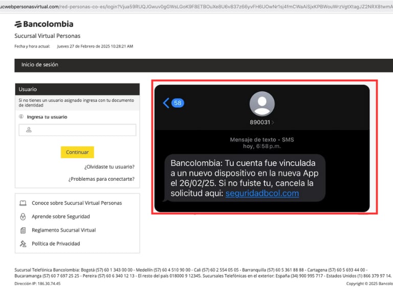 Ejemplo de fraude a usuarios de Bancolombia (Fuente: muchohacker.lol)
